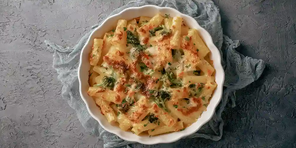 - Eine mittelgrösse Auflaufform mit Öl einpinseln. Pasta, Brokkoli und die Sauce hinein. Mit einem Löffel das Ganze verrühren in der Form und Käse darüber verstreuen.