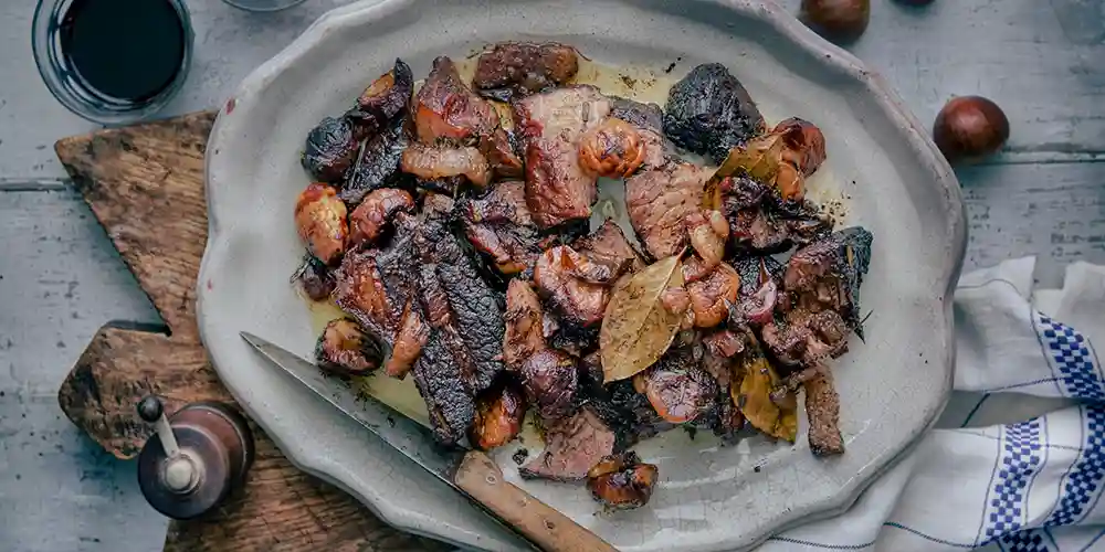 - Die Schalotten abziehen und achteln. In die Pfanne geben, in der das Fleisch angebraten wurde und darin zusammen mit den Marroni etwa 7 – 8 Minuten mit Farbe anrösten. Das Tomatenmark hinzufügen, kurz mitrösten, die Lorbeerblätter hinzufügen und mit dem Rotwein ablöschen. Diesen etwas einreduzieren lassen und mit Piment abschmecken.
